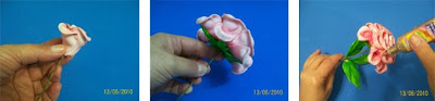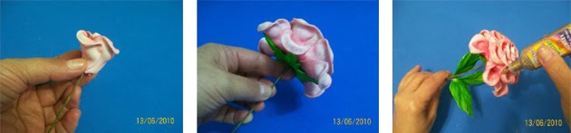 f) Cole uma das partes de pétala (parte menor) no arame que será o cabo da rosa, juntando as pétalas para ir formando a rosa. Em seguida, cole a segunda parte (menor), terceira (maior) e quarta (maior). Por último cole a sépala.