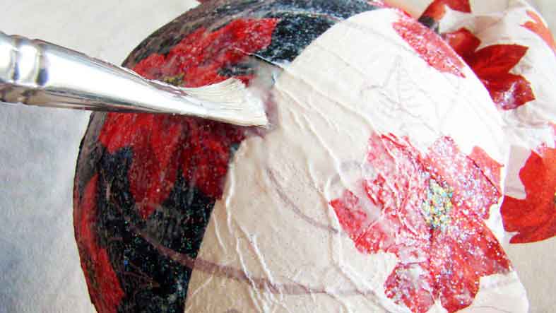 PASSO 3: Acrescente o glitter à cola diluída. Passe esta mistura no guardanapo aderindo-o ao isopor.