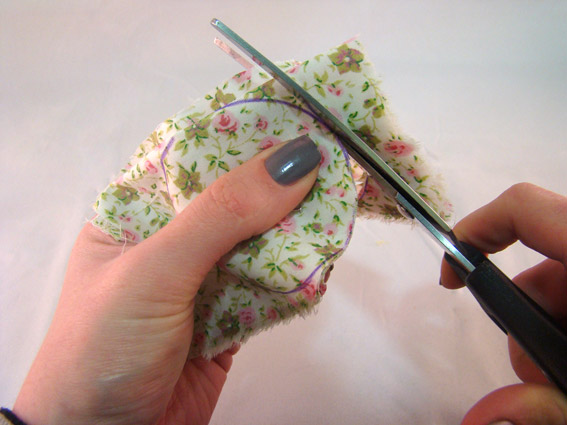 PASSO 1: Numa das extremidades do tecido, faça um círculo de 6 cm de diâmetro. Neste passo a passo utilizamos o gabarito pronto, porém você poderá fazer um molde com um compasso em papel cartão (ou qualquer outro papel mais rígido). Dobre o tecido quatro vezes. Corte o tecido que não será utilizado e coloque o alfinete para prender as dobraduras feitas. Recorte o círculo.