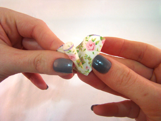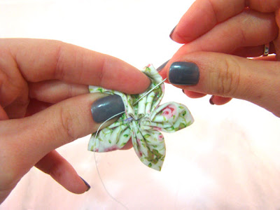 PASSO 3: Ao terminar as demais pétalas é necessário finalizar a flor. Insira a agulha na última pétala, de forma que o ponto seja dado na primeira dobra do franzido, conforme as fotos.