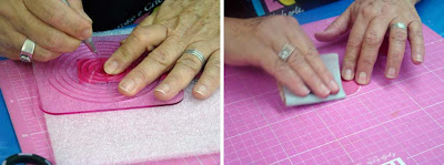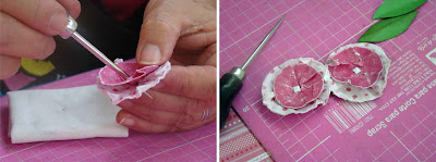 Com o gabarito de corte demarque com lápis 3 círculos grandes em um dos papéis do scrapbook. No outro papel demarque 3 círculos menores. Recorte-os e com a lixa de madeira desbaste sua superfície. Borrife (uma vez) a água e amasse o papel. Faça isso com todos os círculos. Espere secar. Una o círculo menor com o maior perfurando-os com o furador e transpassando a bailarina.