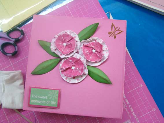 Posicione as peças na tampa da caixa. Cole o recado e as flores com o adesivo banana. Cole as folhas com cola de scrpabook e posteriormente o cordão de bijuteria.