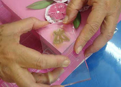 Passe o carimbo dourado no silicone (que neste passo é em formato de borboleta). Pressione sobre a caixa no local desejado.